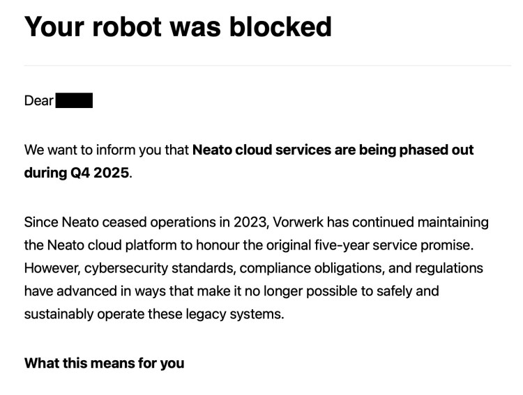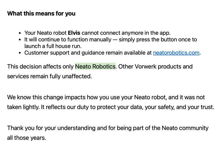 «С момента прекращения деятельности Neato в 2023 году Vorwerk продолжала поддерживать облачную платформу Neato для выполнения первоначального пятилетнего обещания о сервисе. Однако стандарты кибербезопасности, требования соответствия и нормативные акты изменились таким образом, что безопасная и устойчивая эксплуатация этих устаревших систем стала невозможной».